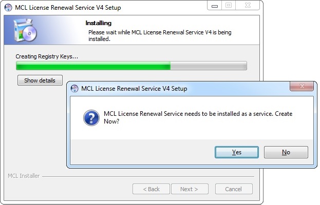 The MCL-License Renewal Service v4's installation begins and, at the same time, you are asked to confirm the type of installation, in this case, as a service: