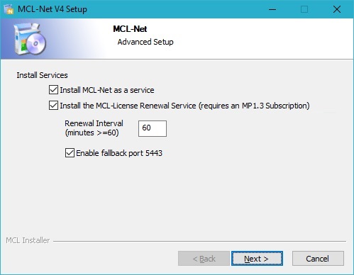 Depending on where you want to install this service, the installation can be included in the MCL-Net v4 Installation (MCL-License Renewal Service option) or dealt with separately.