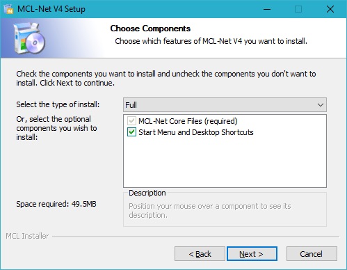 Essential component to the installation. CANNOT be removed from the MCL-Net v4 installation, so the check box is inactive. |